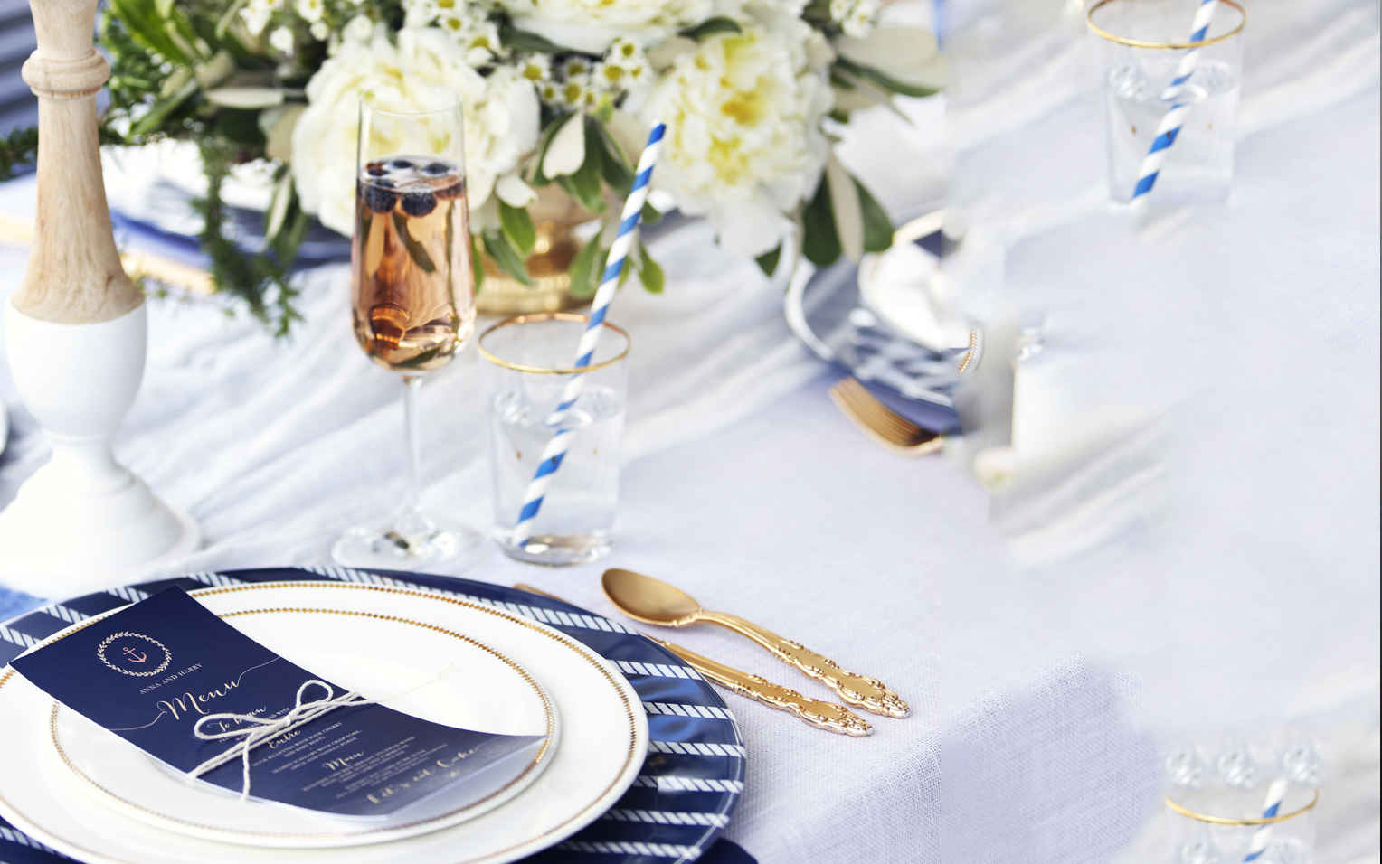 Some fun ways to incorporate the nautical theme into your evening include having guests post a ‘message in a bottle’ instead of a guestbook, or even have them sign a wooden anchor!